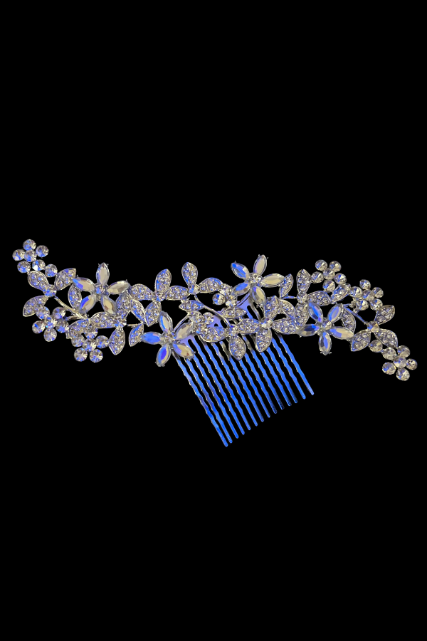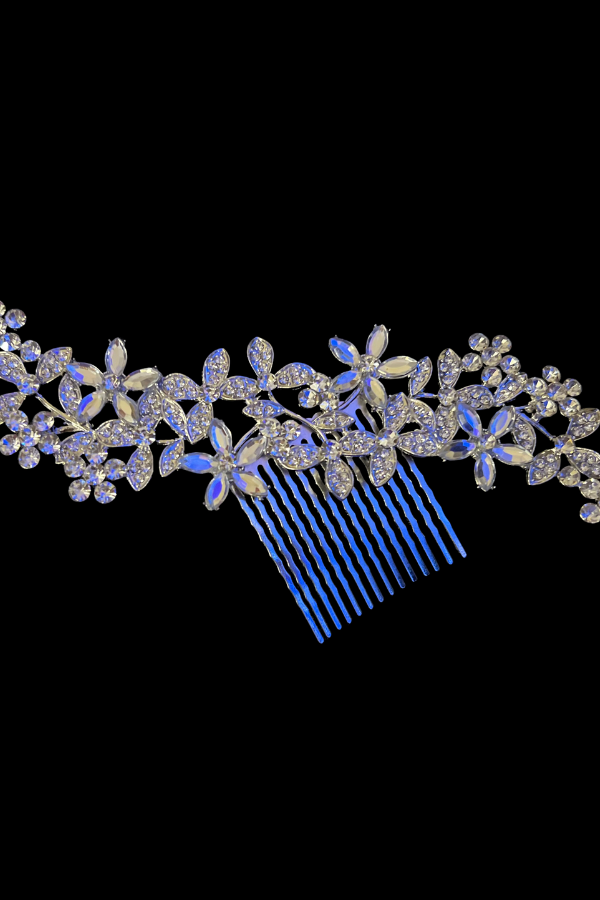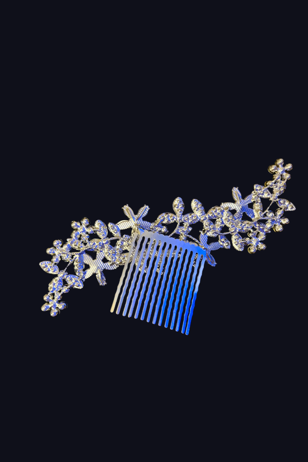 Εντυπωσιακό χτενάκι μαλλιών σε ασημί απόχρωση με περίτεχνο λουλουδένιο σχέδιο. Διακοσμημένο με λαμπερά στρας και κρυστάλλινες λεπτομέρειες, προσθέτει κομψότητα και λάμψη σε κάθε χτένισμα. Ιδανικό για νυφικές εμφανίσεις, βραδινές εξόδους και ιδιαίτερες περιστάσεις.