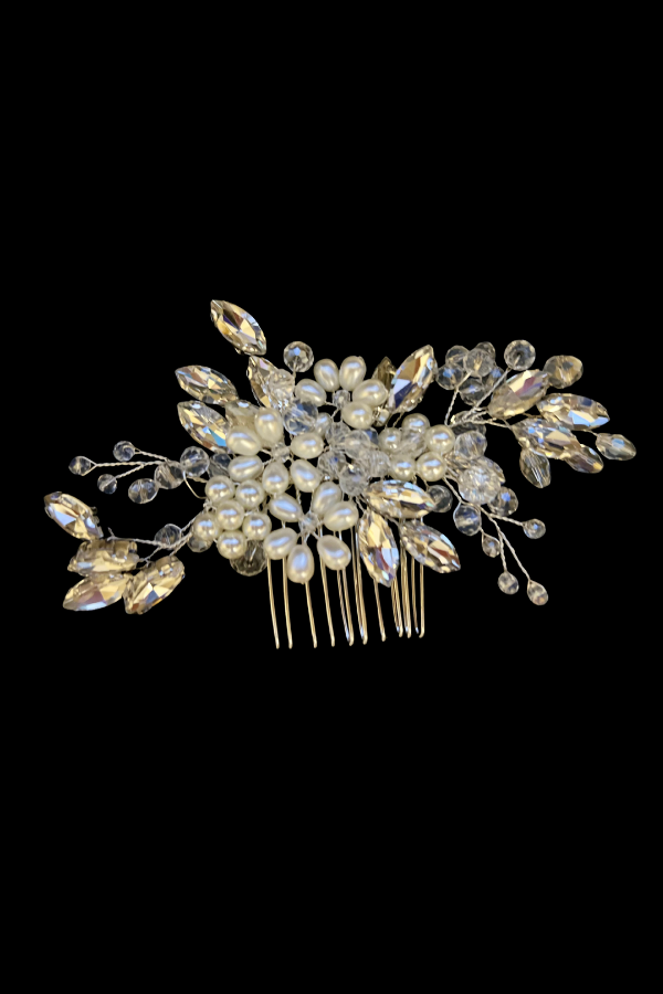 Εντυπωσιακό αξεσουάρ μαλλιών σε ασημί τόνο, διακοσμημένο με λαμπερές κρυστάλλινες πέτρες και λευκές πέρλες σε διάφορα μεγέθη. Ο σχεδιασμός του σε σχήμα λουλουδιού με κλαδάκια προσφέρει πολυτελή και ρομαντική αίσθηση, ιδανική για νυφικές εμφανίσεις ή βραδινές εξόδους.
