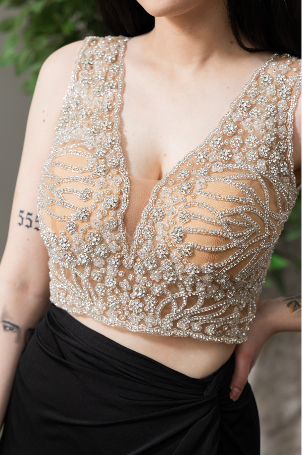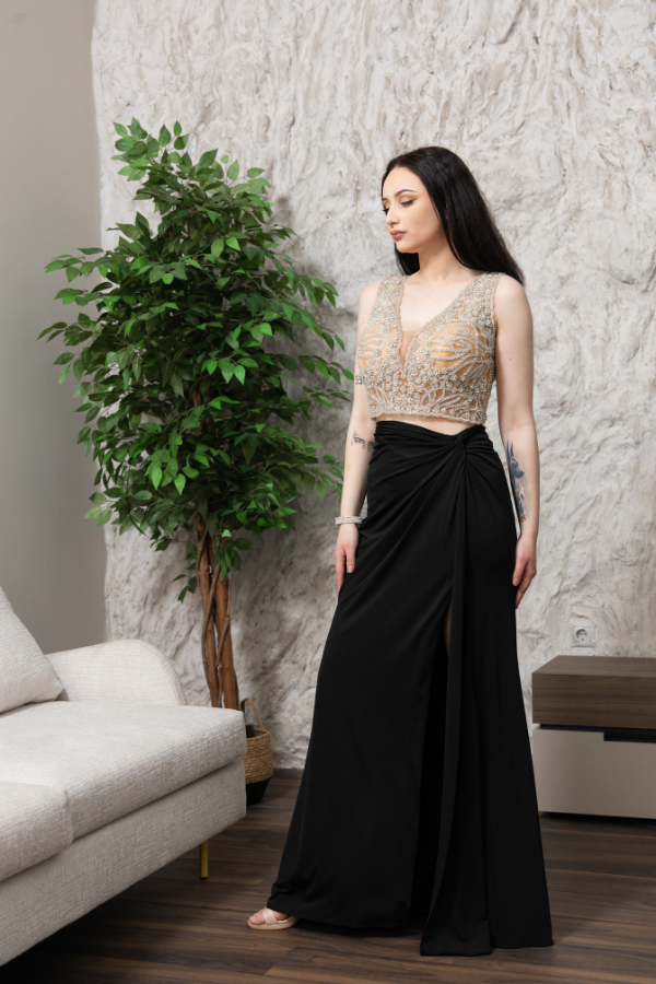 Φόρεμα maxi με κεντημένο μπούστο διακοσμημένο με στρας. Ο σχεδιασμός της φούστες περιλαμβάνει σούρα στο πλάι που προσφέρει μια κολακευτική εφαρμογή, ενώ το ψηλό άνοιγμα προσθέτει δυναμισμό και αισθησιακή .Το μπούστο κλείνει με φερμουάρ, διαθέτει εσωτερικό ύφασμα.