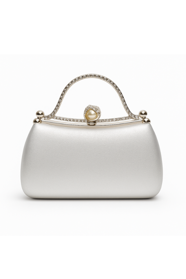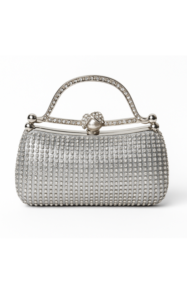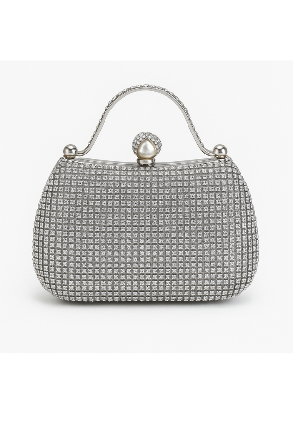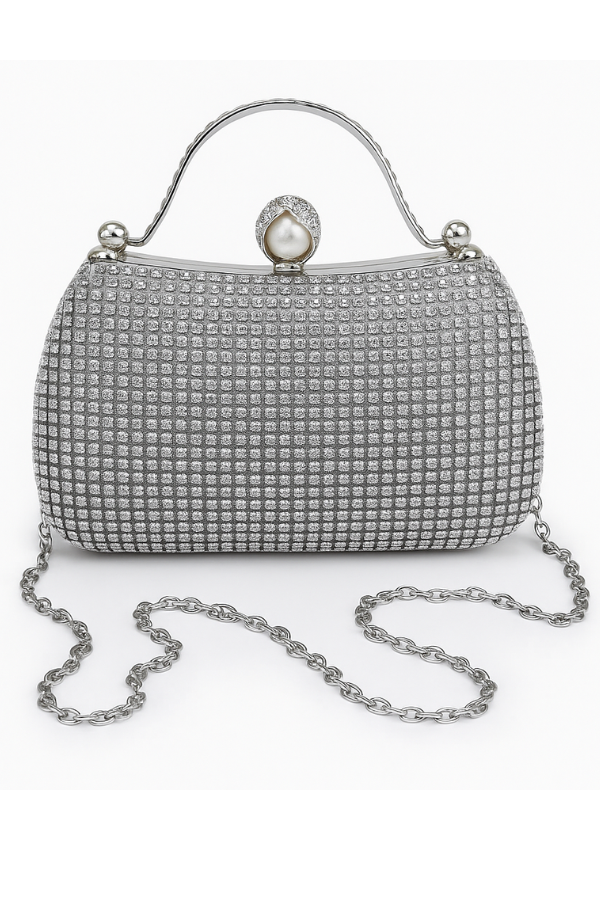 Λαμπερή και κομψή τσάντα evening clutch σε ασημί απόχρωση, διακοσμημένη με κρυστάλλινες πέτρες σε όλη την επιφάνεια. Διαθέτει πολυτελές κούμπωμα με μαργαριτάρι και στρας, καθώς και αλυσίδα για να μπορεί να φορεθεί και στον ώμο.