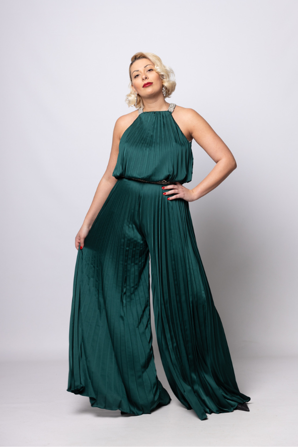 Πλισέ αεράτη ολόσωμη φόρμα σε σατέν με στρας λεπτομέρειες στη μέση και στο λαιμό.