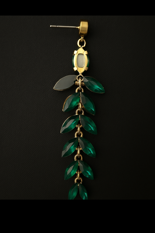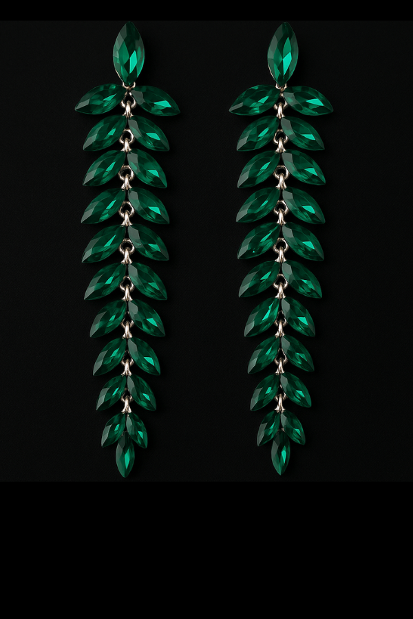 Εντυπωσιακά σκουλαρίκια με μακριά σύνθεση από πράσινες πέτρες σε σχήμα μαρκίζας. Το σχέδιο θυμίζει φύλλα που ενώνονται αρμονικά, δημιουργώντας μια elegant και ταυτόχρονα statement εμφάνιση. Το σμαραγδί χρώμα χαρίζει πολυτέλεια, ενώ το μήκος τους τα κάνει ιδανικά για εντυπωσιακές βραδινές εμφανίσεις.
