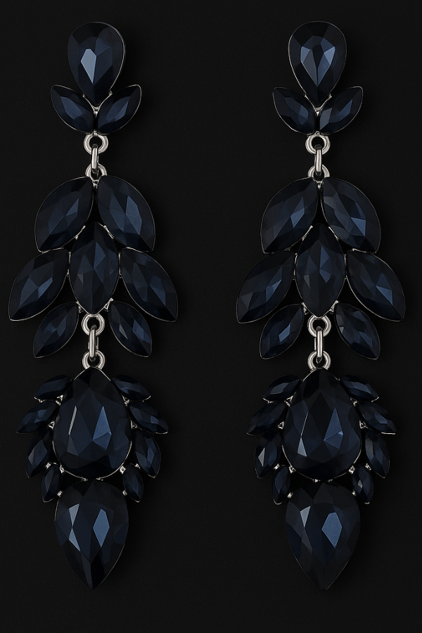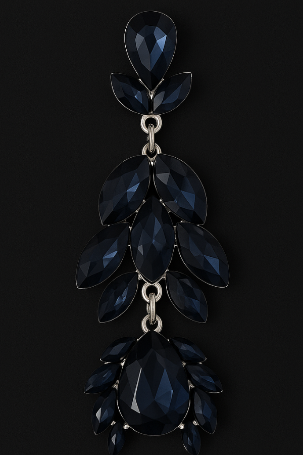 Εντυπωσιακά μακριά σκουλαρίκια με πέτρες σε βαθύ μπλε χρώμα (sapphire/navy), σε σχήμα δάκρυ και μαρκίζας. Οι πέτρες είναι τοποθετημένες σε cascading διάταξη, δημιουργώντας ένα κομψό και πολυτελές σχέδιο που τραβάει τα βλέμματα.