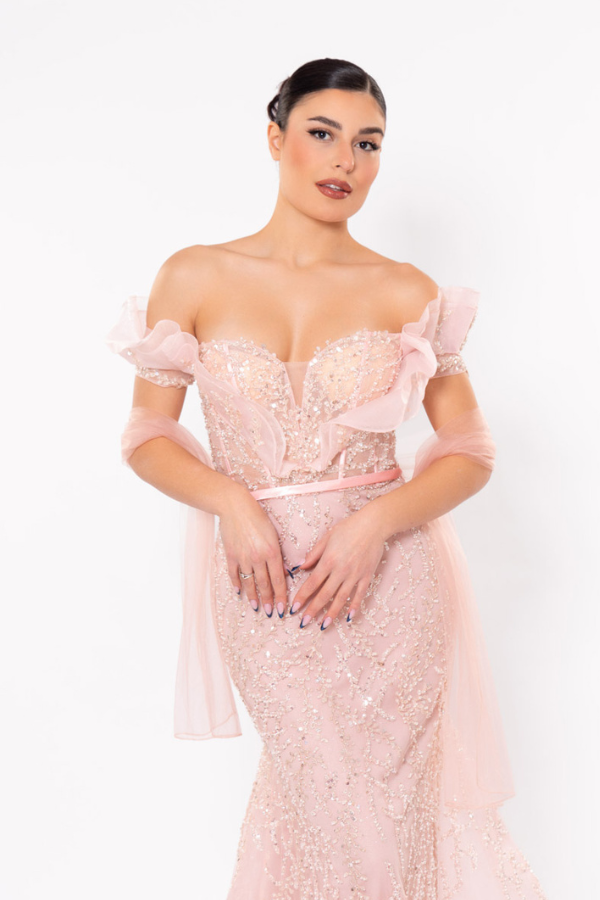 Μακρύ φόρεμα με glitter εφαρμοστό σε γοργονέ γραμμή σε απαλό ροζ χρώμα με ντεκολτέ και τούλι στο μπούστο με κεντημένη ζώνη .Έχει βαθύ άνοιγμα στην πλάτη και ουρά στο τελείωμα ,επίσης συνοδεύεται με εσάρπα από μουσελίνα στο ίδιο χρώμα. Ενα βραδινο φορέμα για γάμους και άλλες επίσημες εμφανίσεις.