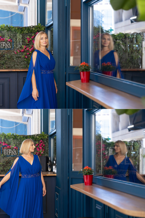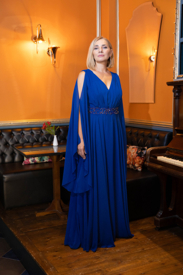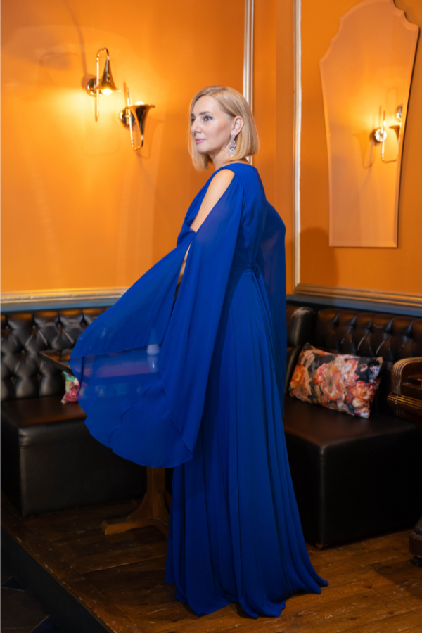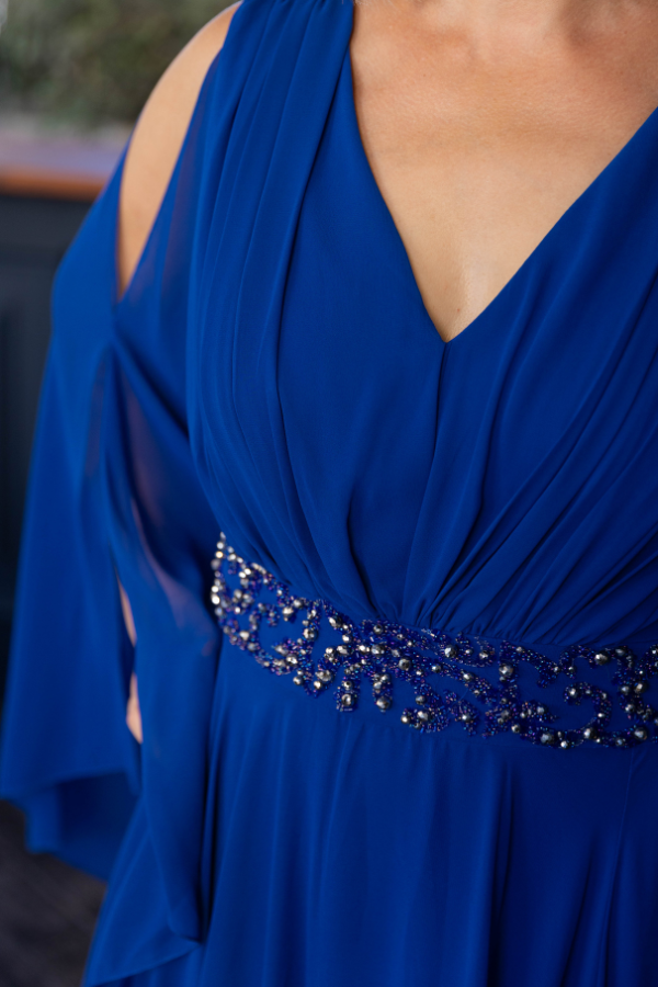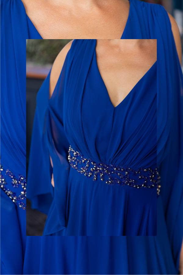 Εντυπωσιακό και αριστοκρατικό φόρεμα σε έντονο μπλε χρώμα, σχεδιασμένο για να χαρίζει κομψότητα σε κάθε επίσημη εμφάνιση. Διαθέτει V λαιμόκοψη που αναδεικνύει το ντεκολτέ και αέρινα μακριά μανίκια με σκίσιμο, που προσφέρουν ροή και ρομαντισμό στην κίνηση.