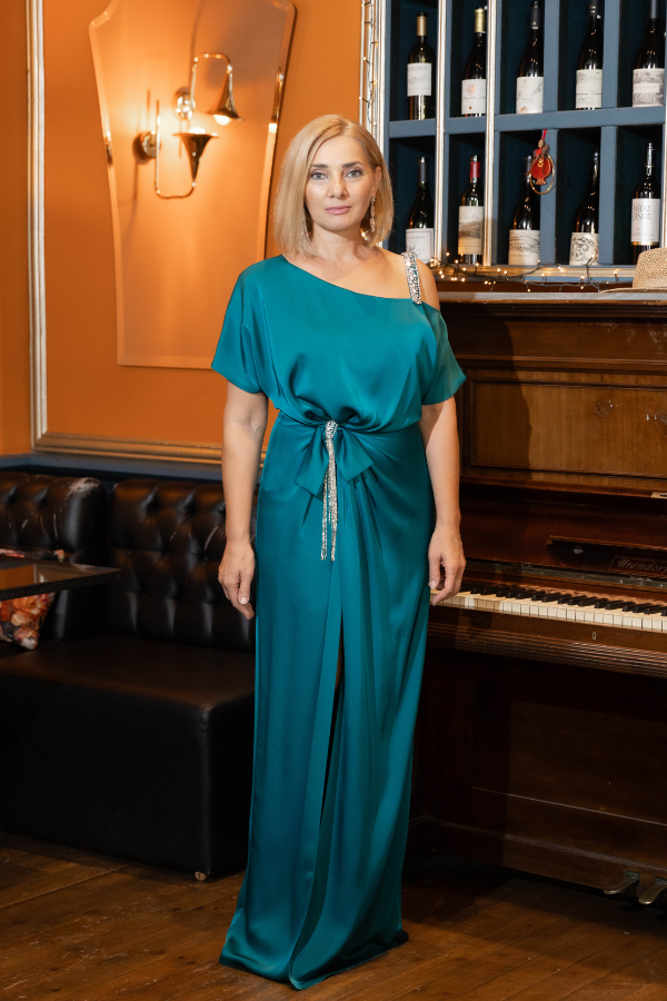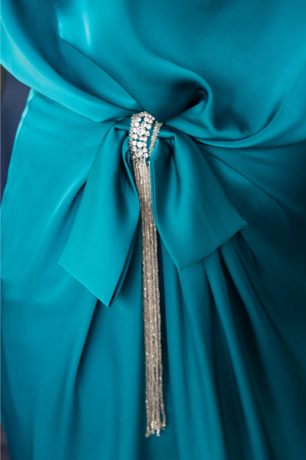 Μακρύ σατέν φόρεμα σε πετρόλ απόχρωση με ανοιχτούς ώμους
