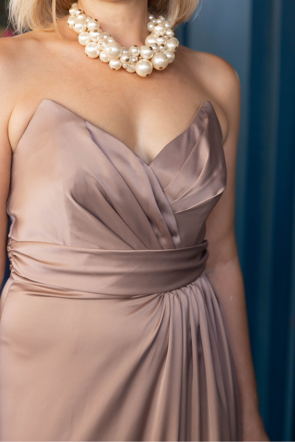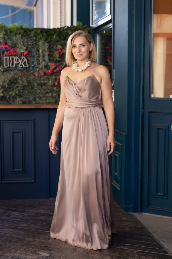 Μακρύ strapless σατέν φόρεμα σε μπεζ-σαμπανί απόχρωση