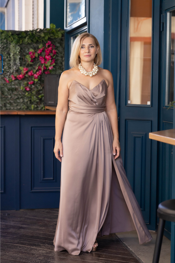Η τονισμένη μέση με ζώνη από το ίδιο ύφασμα κολακεύει τη σιλουέτα, ενώ η μακριά φούστα σε ρέουσα γραμμή προσφέρει αέρινη κίνηση και εκλεπτυσμένο ύφος. Το σατέν ύφασμα με διακριτική γυαλάδα φωτίζει την εμφάνιση, κάνοντάς το ιδανικό για γάμους, δεξιώσεις και βραδινά gala.