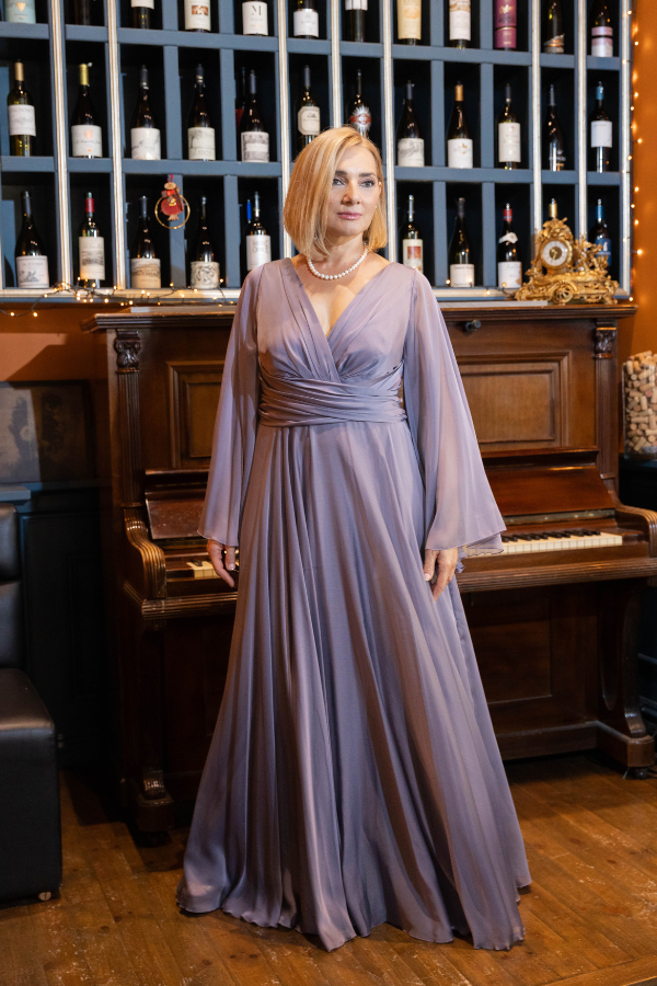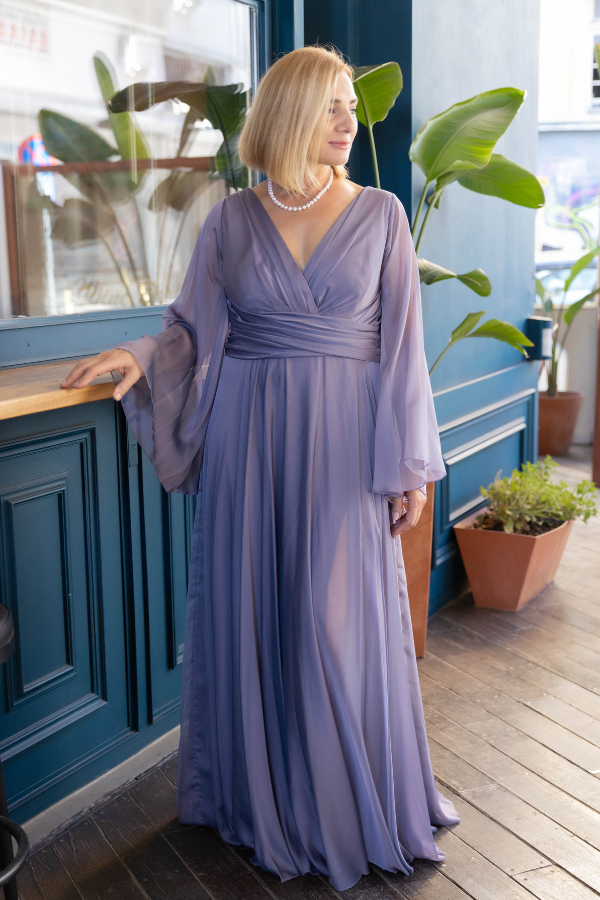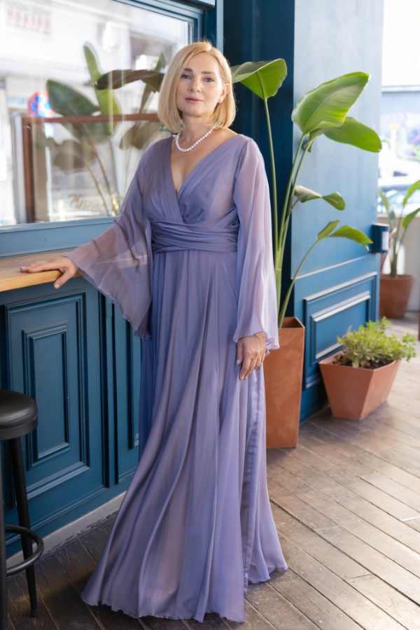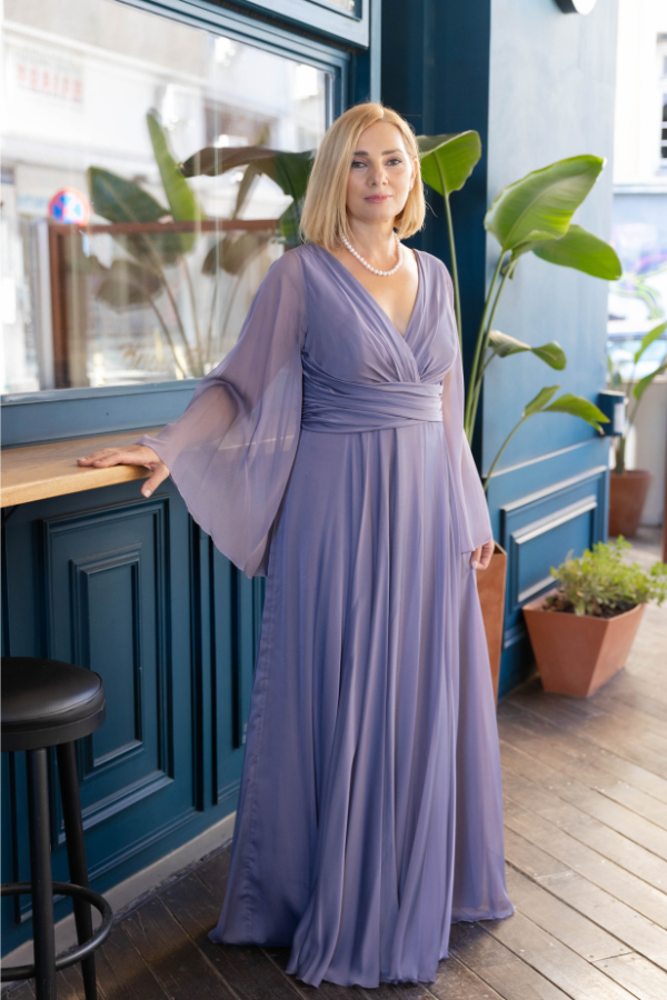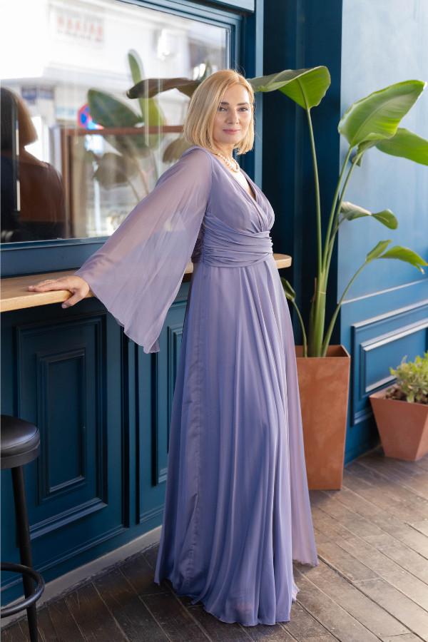 Εντυπωσιακό μακρύ φόρεμα με V λαιμόκοψη και αέρινα μακριά μανίκια που χαρίζουν κομψότητα και ελευθερία στην κίνηση. Η μέση είναι τονισμένη με κομψές πτυχώσεις, κολακεύοντας τη σιλουέτα, ενώ η μακριά, ρέουσα φούστα δημιουργεί ρομαντική και αριστοκρατική εικόνα.