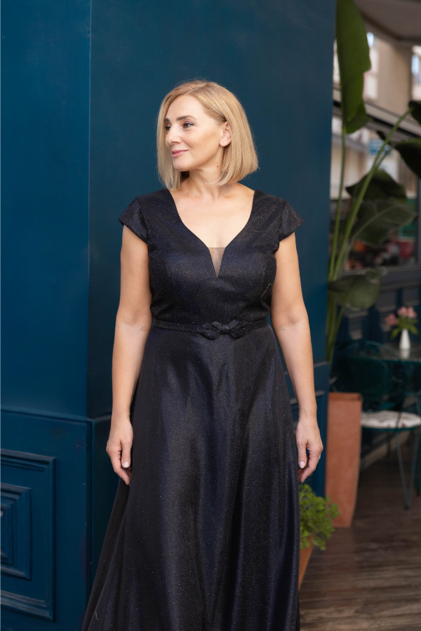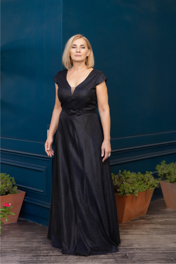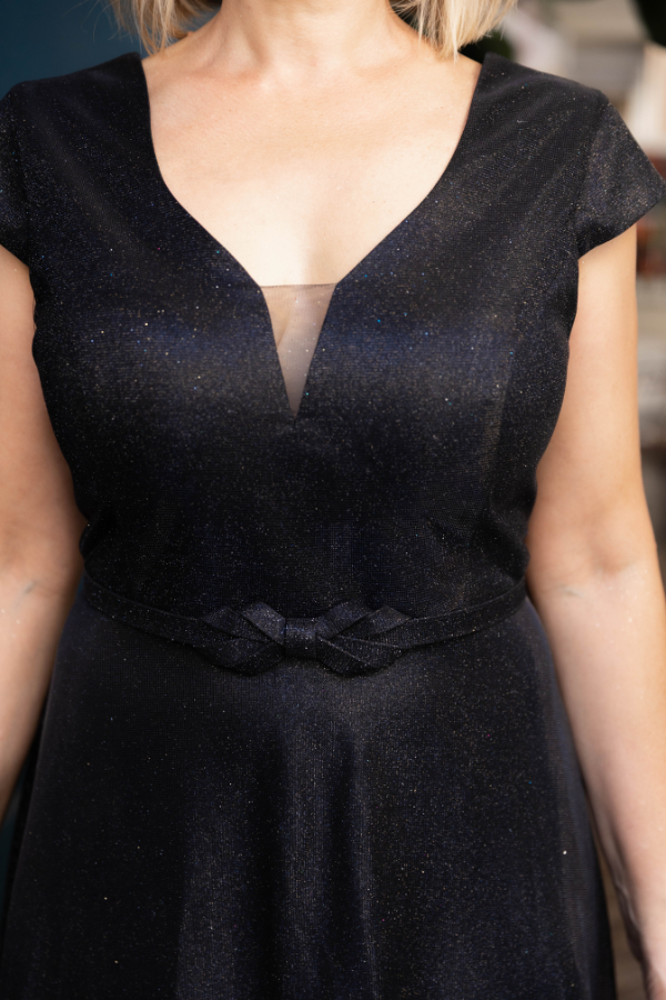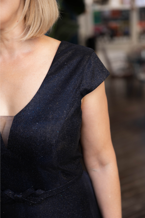 Κλασικό και διαχρονικό βραδινό φόρεμα σε μαύρη απόχρωση με διακριτική γυαλάδα που χαρίζει πολυτέλεια. Διαθέτει V λαιμόκοψη που κολακεύει το ντεκολτέ, κοντά μανίκια για κομψότητα και άνεση, καθώς και ζώνη στη μέση με διακριτική λεπτομέρεια που τονίζει τη σιλουέτα.