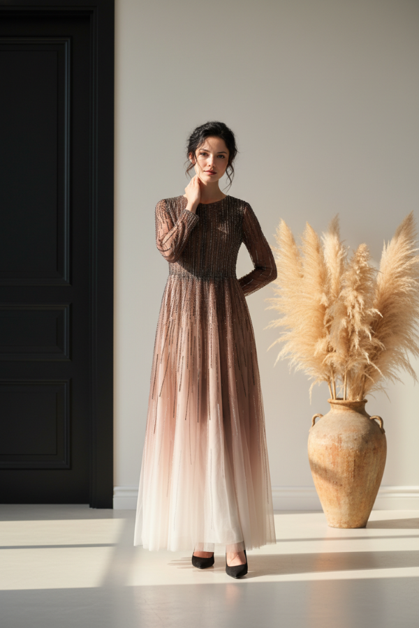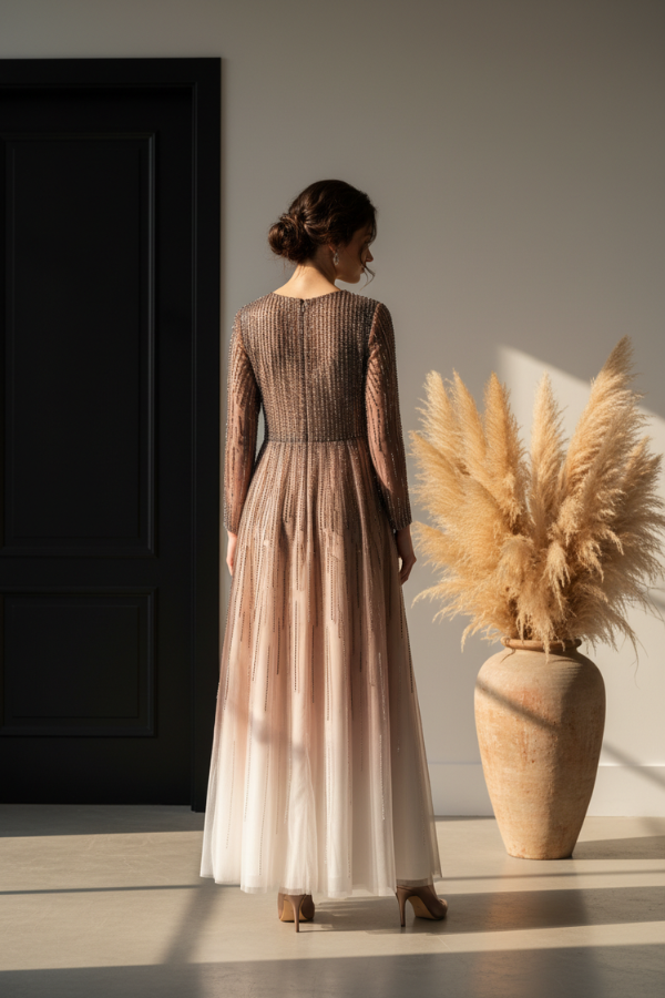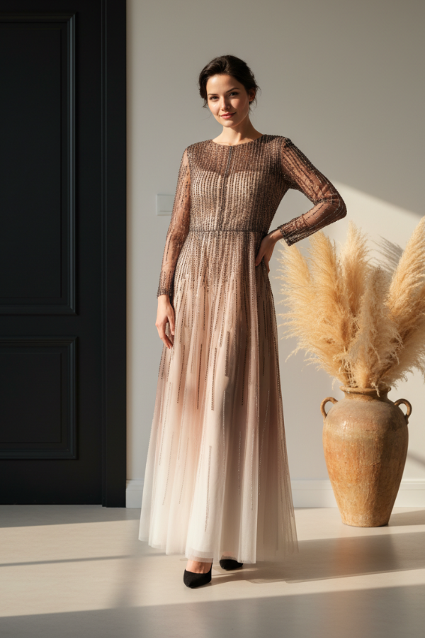Μακρύ βραδινό φόρεμα σε nude–σαμπανί απόχρωση, που αποπνέει διακριτική πολυτέλεια και ρομαντισμό. Το επάνω μέρος διαθέτει μακριά μανίκια και φίνο διάφανο ύφασμα με λεπτές shimmer λεπτομέρειες, χαρίζοντας κομψή λάμψη χωρίς υπερβολή. Η γραμμή του φορέματος αγκαλιάζει απαλά το σώμα στο μπούστο και τη μέση, αναδεικνύοντας τη σιλουέτα με φυσικό τρόπο.