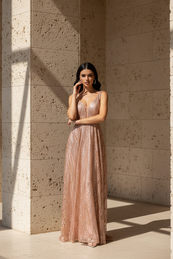 Μακρύ βραδινό φόρεμα σε σαμπανί / ροζ χρυσή απόχρωση με διακριτική λάμψη. Διαθέτει V ντεκολτέ, φαρδιές τιράντες και αέρινη γραμμή που χαρίζει κομψή κίνηση. Το ελαφρώς γυαλιστερό ύφασμα προσφέρει πολυτελή εμφάνιση, ενώ η άνετη εφαρμογή το καθιστά ιδανικό για πολύωρη χρήση.
