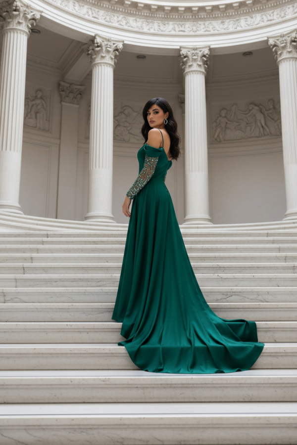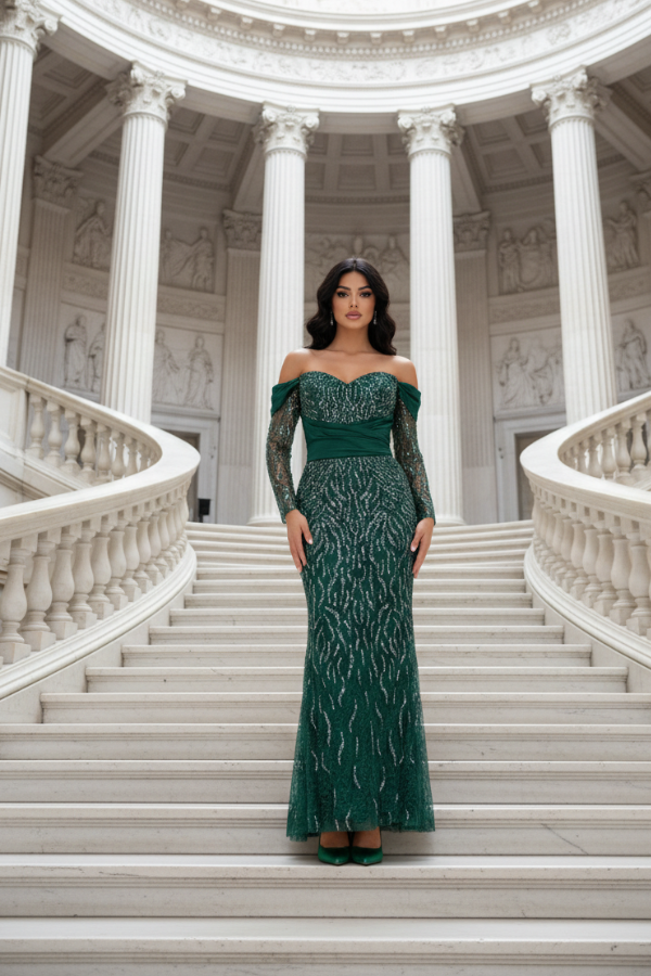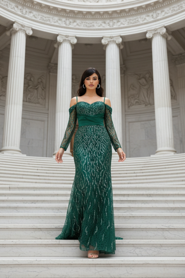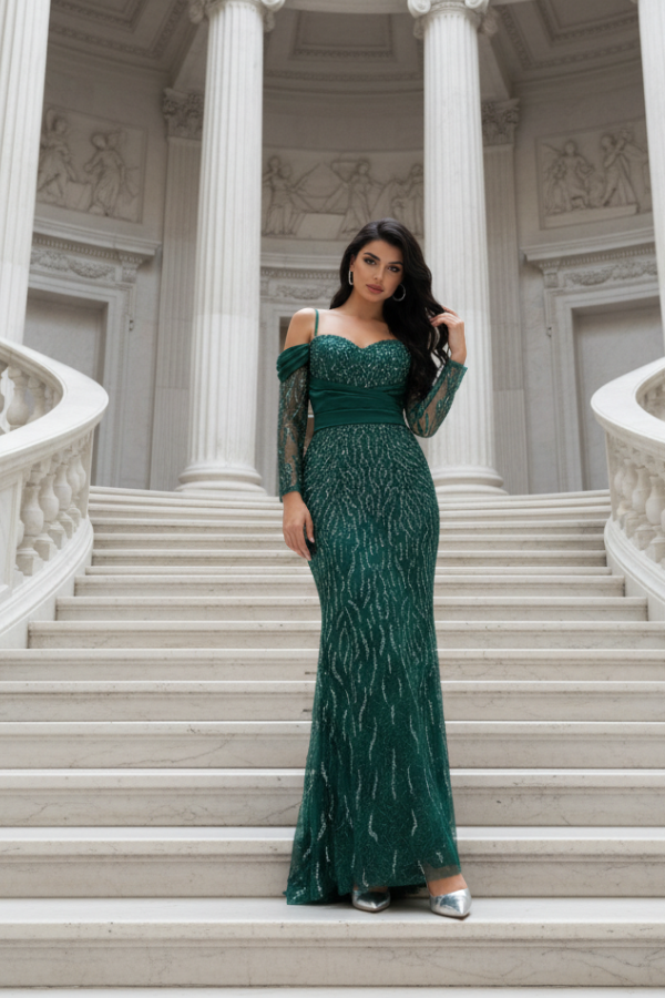 Μακρύ βραδινό φόρεμα σε βαθύ σμαραγδί χρώμα, που αποπνέει πολυτέλεια και διαχρονική κομψότητα. Το επάνω μέρος διαθέτει strapless ντεκολτέ   διακοσμημένο με λεπτομέρειες από λαμπερό ύφασμα, οι οποίες προσθέτουν διακριτική λάμψη και αναδεικνύουν το μπούστο. Τα off-the-shoulder μακριά μανίκια από διάφανο ύφασμα με shimmer λεπτομέρειες χαρίζουν αέρινη αίσθηση και ρομαντικό χαρακτήρα.