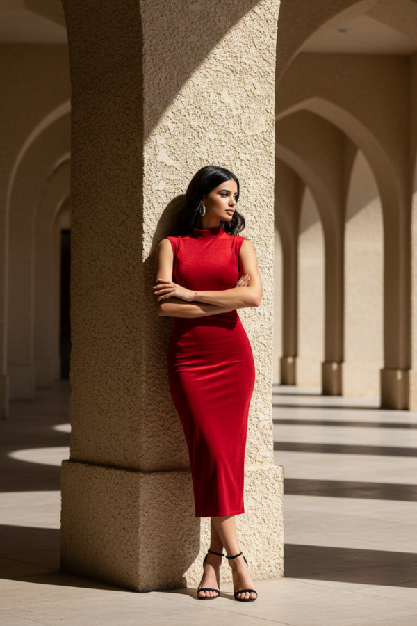 Midi βελούδινο φόρεμα σε έντονο κόκκινο χρώμα, με αμάνικο σχέδιο και διακριτικό ψηλό λαιμό που χαρίζει κομψότητα και δυναμισμό. Η στενή γραμμή αγκαλιάζει το σώμα, αναδεικνύοντας τη σιλουέτα, ενώ το μήκος κάτω από το γόνατο προσφέρει chic και διαχρονική αισθητική. Το βελούδινο ύφασμα προσδίδει πολυτελή υφή και άνετη εφαρμογή.