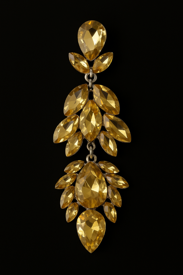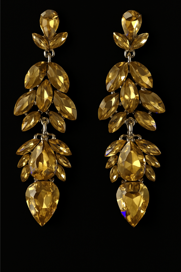 Εντυπωσιακό μακρύ σκουλαρίκι σε πολυτελή χρυσαφί απόχρωση. Οι πέτρες σε σχήμα δάκρυ και μαρκίζας είναι τοποθετημένες σε cascading διάταξη, δημιουργώντας ένα λαμπερό και glamorous αποτέλεσμα. Η παιχνιδιάρικη αντανάκλαση του φωτός αναδεικνύει το σχέδιο και προσφέρει μοναδική λάμψη σε κάθε εμφάνιση.