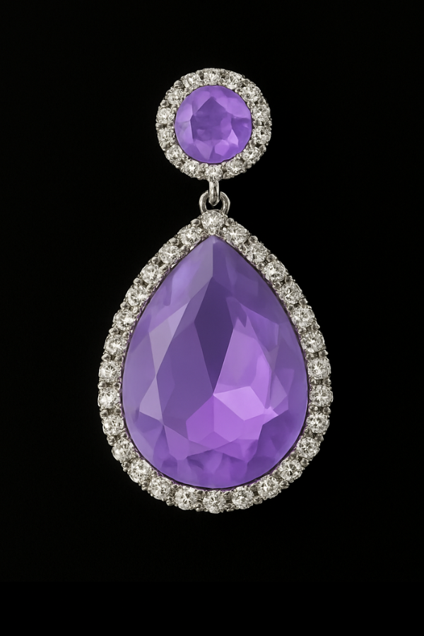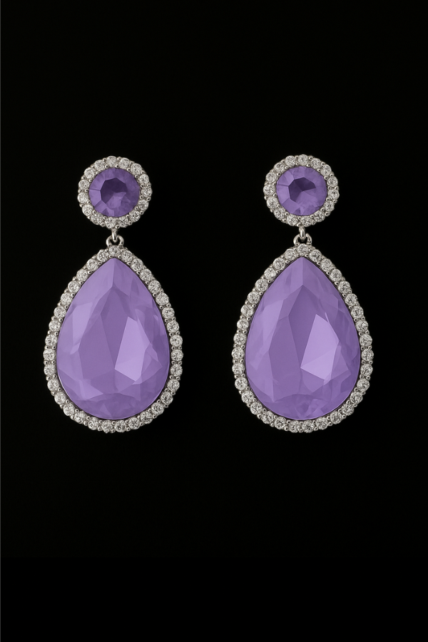 Κομψό και εντυπωσιακό σκουλαρίκι με δάκρυ πέτρα σε απαλό λιλά χρώμα. Η κεντρική πέτρα πλαισιώνεται από λαμπερά λευκά στρας, που τονίζουν τη λάμψη της και χαρίζουν πολυτέλεια. Στο επάνω μέρος, μια μικρότερη στρογγυλή λιλά πέτρα προσθέτει ισορροπία και φινέτσα.