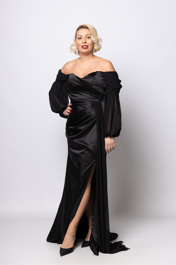 Φόρεμα αμπιγιε σε μαύρο χρώμα με φούστα από σατέν και μανίκια από μουσελίνα.