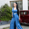 Maxi βραδινό γαλάζιο σατέν φόρεμα υψηλής ραπτικής με άνοιγμα στο πλάι ουρά και σχέδιο με πετράδια.