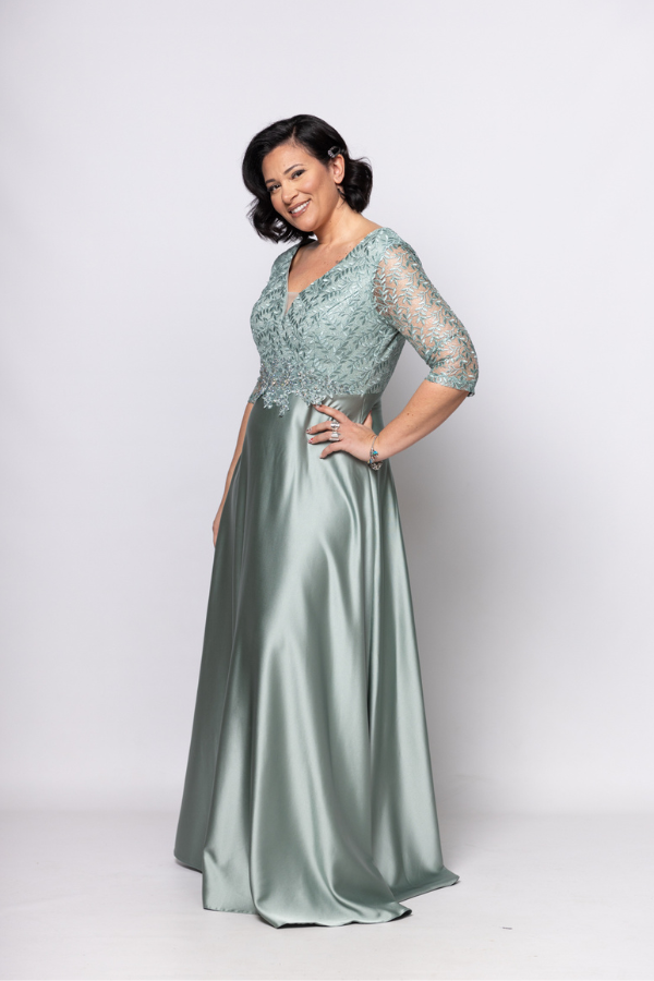 Βραδινό φόρεμα σε ανοιχτό βεραμάν χρώμα μακρύ με δαντελένιο μπούστο και μανίκι 3/4 τέταρτα σατέν φούστα .