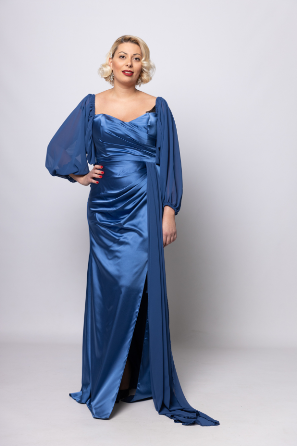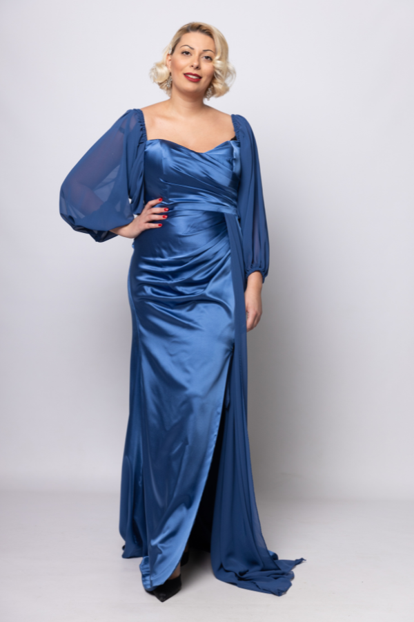Φόρεμα αμπιγιε σε μπλε ρουά χρωμα με φούστα από σατέν και μανίκια από μουσελίνα.