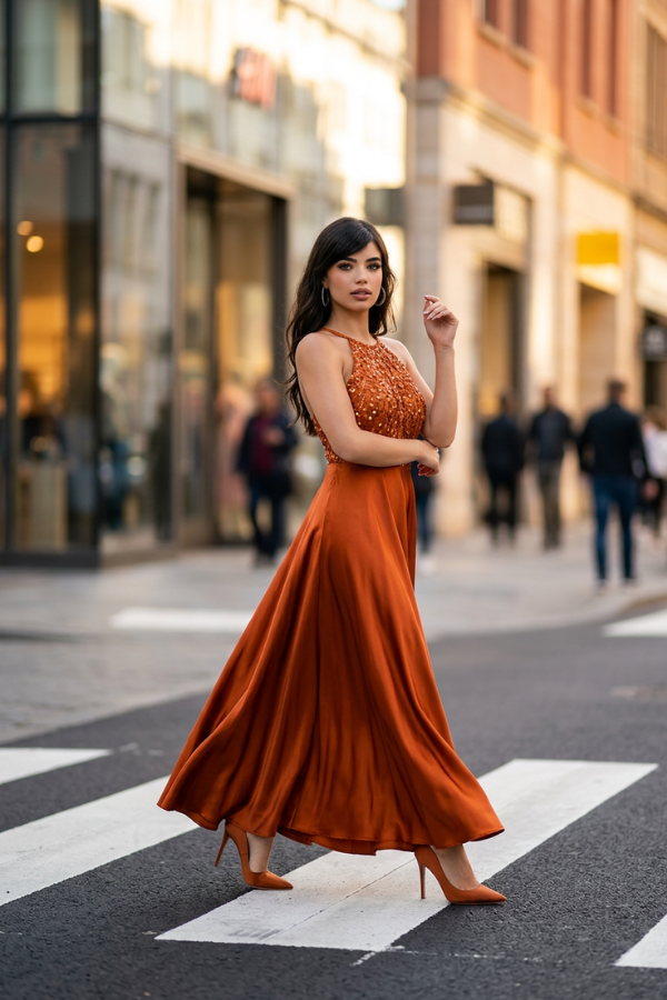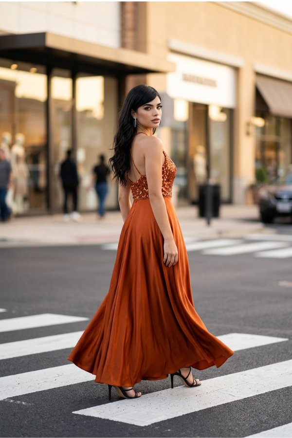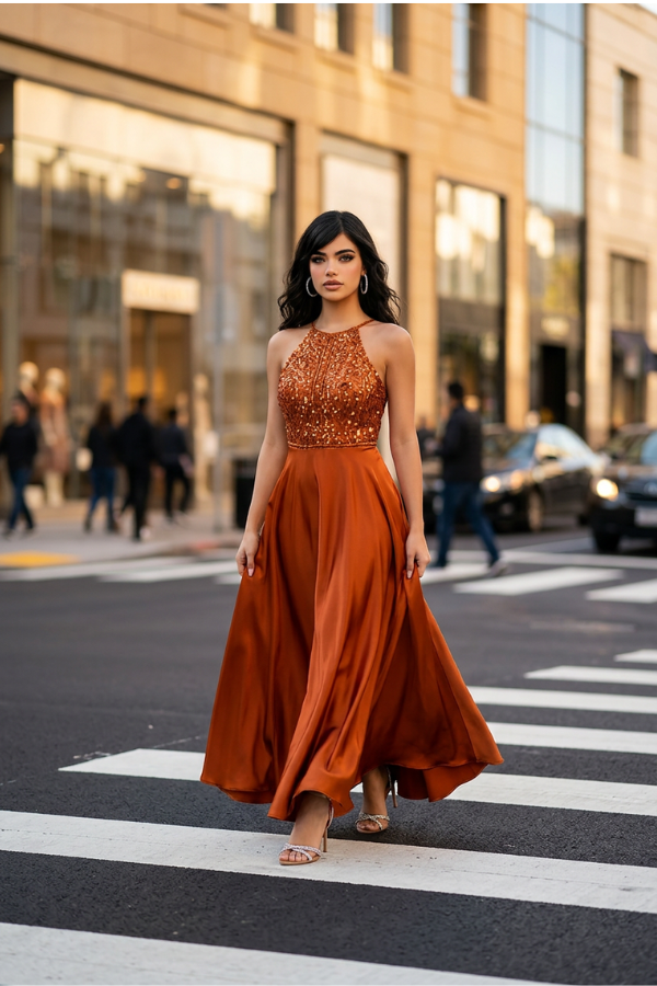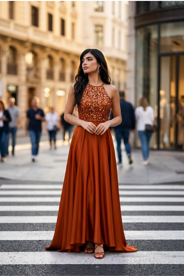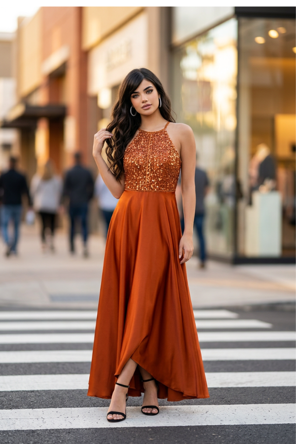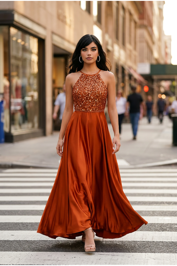Εντυπωσιακό maxi φόρεμα σε ζεστή απόχρωση του χαλκού που αποπνέει κομψότητα και λάμψη. Το πάνω μέρος είναι διακοσμημένο με λαμπερές παγιέτες που προσθέτουν πολυτέλεια και τραβούν τα βλέμματα, ενώ η λαιμόκοψη τύπου halter αναδεικνύει όμορφα τους ώμους και το ντεκολτέ.