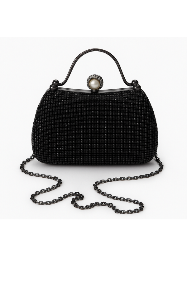 Κομψό και διαχρονικό clutch για κάθε ιδιαίτερη περίσταση. Το σώμα της τσάντας είναι επενδυμένο με μαύρα στρασάκια σε πλέγμα, δημιουργώντας μια πολυτελή αλλά ταυτόχρονα μίνιμαλ εμφάνιση. Το κλείσιμο με μαργαριταρένιο κουμπί και διακριτικές κρυστάλλινες λεπτομέρειες προσδίδει μοναδική φινέτσα.